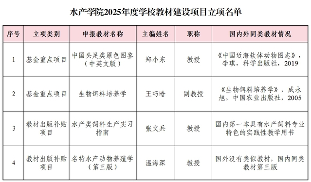 学校2025年度教材建设项目自启动以来,经过个人申请,澳门彩票 组织审核推荐,学校组织专家评审,学校教材工作领导小组审议,澳门彩票 推荐的4本教材都获得了立项支持。其中,《中国头足类原色图鉴(中英文版)》和《生物饵料培养学》获得学校基金重点项目立项。《水产类饲料生产实习指南》和《名特水产动物养殖学(第三版)》获得教材出版补贴全额资助。