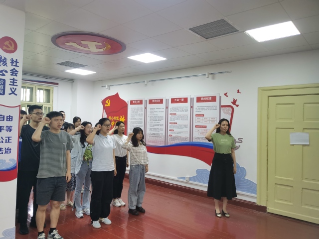 党课结束后,与会师生进行新发展党员入党宣誓与重温入党誓词活动,入党宣誓仪式在雄壮的《国际歌》声中拉开帷幕,在2018级渔业资源硕士党支部书记马亚宸的带领下,师生党员面对鲜红的党旗,庄严宣誓,历下铮铮誓言。