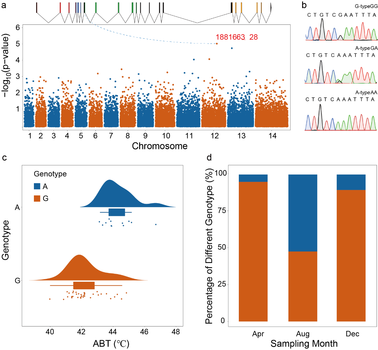 图一:条纹隔贻贝基因组中与热耐受性相关的同义突变位点,及其在来自三个季节的贻贝种群中的基因频率
