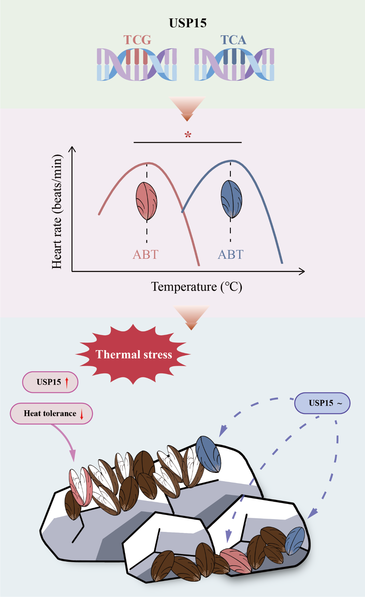 研究生物对环境变化的适应性机制是气候变化生物学研究的核心命题。突变等在遗传结构上的变化被认为是驱动生物适应性进化的重要因素。同义突变造成了编码序列中的碱基替换,但编码的氨基酸序列却保持不变,因此在表面上这些替换不会影响生命活动,并常被称作“沉默突变”。而本研究却“于无声中处听惊雷”,关注并分析了同义突变在生物对高温环境适应性中造成的影响。研究首先通过生物信息学分析,得到了在条纹隔贻贝基因组中的一个与高温耐受能力显著相关的同义突变位点,且该位点处于去泛素化酶USP15基因中,而USP15基因最受关注的生物学效应便是抑制线粒体自噬。由于线粒体自噬是生物应对高温时的机体自我保护的关键过程,因而该研究通过分子模拟以及实验验证等多种手段,进一步去深入探究了同义突变对贻贝USP15基因表达过程的影响,发现该突变位点具有影响USP15基因转录得到的mRNA在不同温度下的结构稳定性以及影响细胞内含量的功能。总而言之,该研究指出同义突变并不“沉默”,能够参与甚至改变生物对环境的适应能力;这些突变在探究生物适应性的研究工作中不应该是“默默无闻”的,更多的研究工作仍需持续探究同义突变的在生物适应性中发挥的影响。
