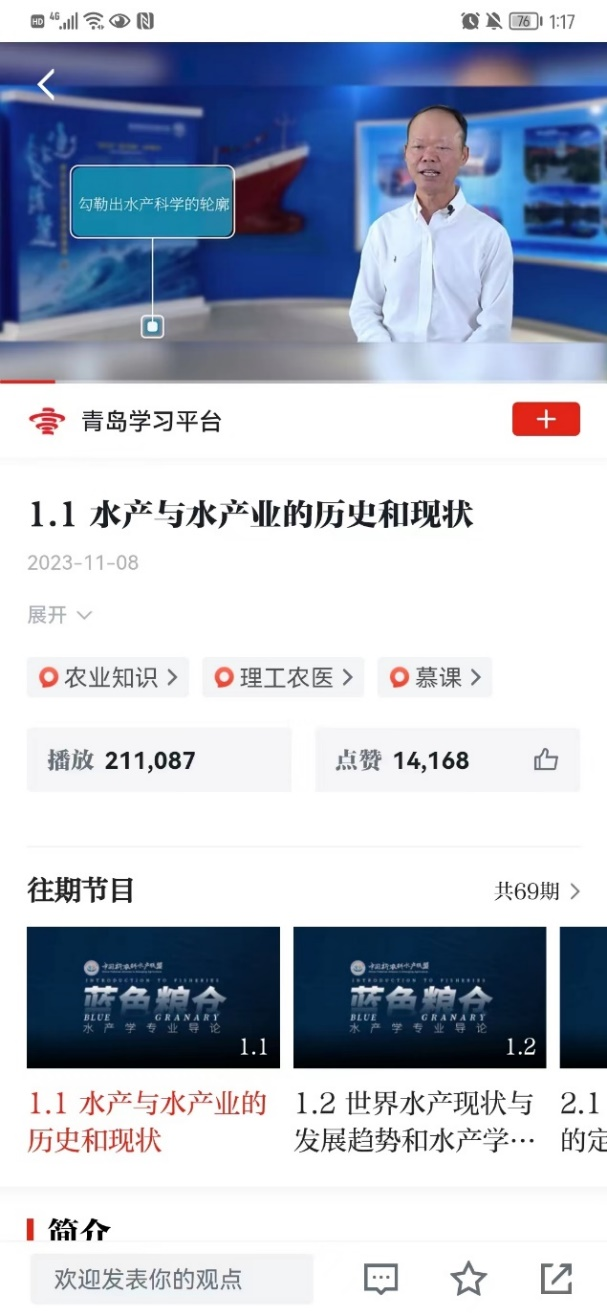 由澳门彩票 麦康森院士总策划,温海深教授总负责,21家全国新农科水产教育联盟单位共同建设的视频课程《蓝色粮仓-水产学专业导论》,2023年11月8日在“学习强国”上线并面向社会开放,从而为高校师生和广大社会学习者提供优质学习资源,距离上线不到2个月的时间,本课程总播放量超过130万次,点赞数超过6万。