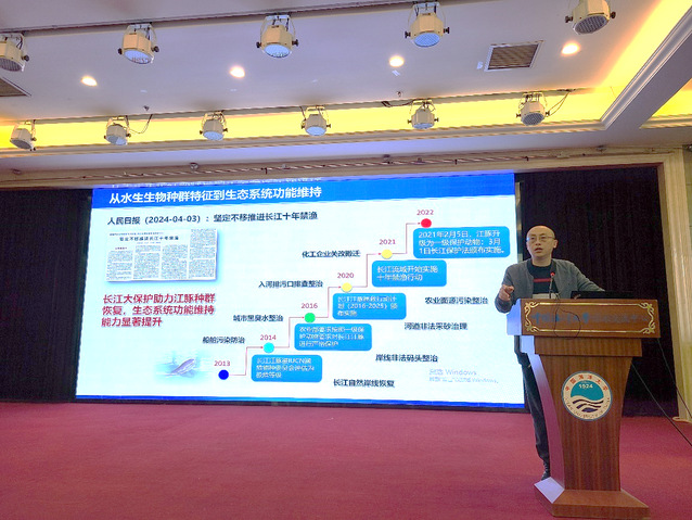 徐军研究员汇报题目为《从水生生物种群特征到生态系统功能维持理论与案例》。报告以洱海水生植物修复、浮游动物维持湖泊清水期以及“十年禁渔”对长江江豚食物网营养特征的演变为典型案例,研究以物质循环、食物网相互作用和生物多样性为主线,将大尺度数据收集与野外调查相结合的研究方法,阐释了沉水植物生态位适应和维持机制,揭示了适应性变异引起的生态位分化以及群落构建机制,同时证明采用食物网历史重构的方法将江豚作为哨兵物种的科学性。