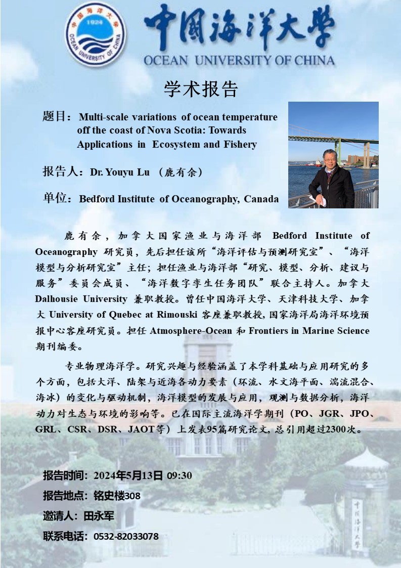 【学术报告】Multi-scale variations of ocean temperature off the coast of Nova Scotia: Towards Applications in Ecosystem and Fishery