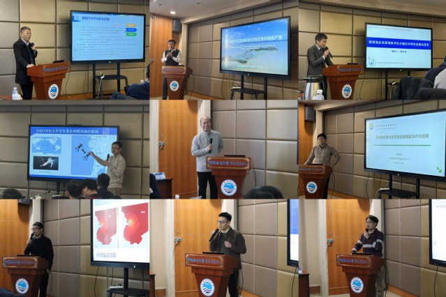 上午的会议由薛莹教授主持。张朝晖研究员作了题为《我国海洋保护地建设进展与展望》的汇报,回顾了我国海洋保护区的发展和管理历程,并介绍了当前海洋保护区的发展现状和规划;王迎宾所长作了题为《基于VMS的双拖渔船航行特征预测渔船产量》的汇报,介绍了双拖网渔船的渔船监控系统的发展现状和应用结果,为解决我国渔业资源调查和评估的现状问题提供新见解;南海水产研究所陈作志主任作了题为《南海渔业资源调查评估关键技术研究进展和思考》的汇报,介绍了南海渔业资源的组成和分布特点及发展历程,并对未来资源调查评估工作提出了思考;张帆教授作了题为《气候事件对大洋渔业生物的影响研究》的汇报,以金枪鱼和茎柔鱼为例,介绍了ENSO事件对其时空动态和种群洄游的影响。