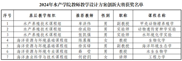 经过参赛教师提交教学设计方案、各基层教学组织组织专家进行审核推荐、澳门彩票 组织专家进行评审等环节,根据评审专家意见,共有“甲壳动物增养殖学”等7门课程的教学设计方案荣获“最佳教学创新奖”。