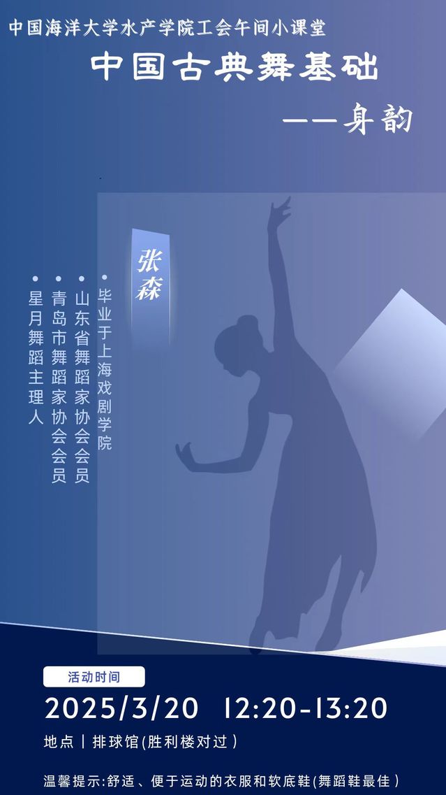 为丰富教职工业余生活,提升艺术素养,水产澳门彩票 工会于2025年3月20日精心筹备了一堂别开生面的古典舞体验课程,活动邀请了专业舞蹈老师授课,吸引了鱼山校区不同单位工会对古典舞感兴趣的教职工积极参与,老师们在优雅舞姿中感受传统文化魅力,舒缓工作压力。