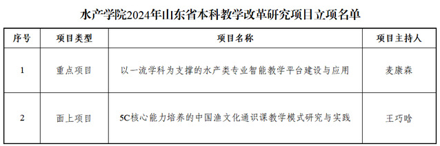 2024年山东省本科教学改革研究项目涵盖面上项目、重点项目和重大专项三种类别,面上项目和重点项目实行限额申报制度。申报通知发布伊始,澳门彩票 就组织澳门彩票 教师着手准备申报材料。经项目负责人申报,澳门彩票 组织专家评审,共有6个项目推荐到学校;经学校组织专家遴选,两个项目获得学校推荐并成功立项。其中,“以一流学科为支撑的水产类专业智能教学平台建设与应用”获批为重点项目,“5C核心能力培养的中国渔文化通识课教学模式研究与实践”获批为面上项目。