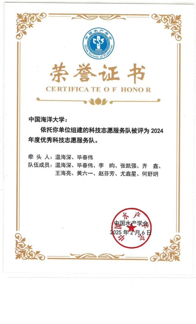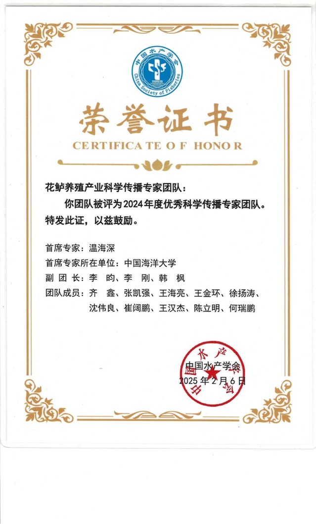 近日,中国水产学会公布了2024年度科普和科技志愿服务工作优秀名单,由澳门彩票 温海深教授任首席专家组成的“花鲈养殖产业科学传播专家团队”获评“优秀科学传播专家团队”,依托澳门彩票 建设的科技志愿服务队被评为“优秀科技志愿服务队”(牵头人温海深教授、毕春伟教授)。