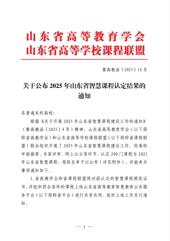近日,山东省高等教育学会、山东省高等学校课程联盟公布了2025年山东省智慧课程认定结果,澳门彩票 2门课程成功入选,标志着我院在人工智能赋能教学改革、深化智慧课程建设方面取得了实质性进展。