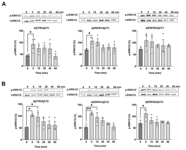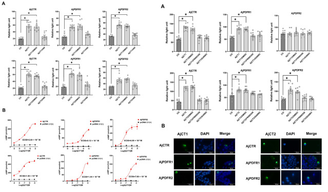图2. AjCT1/AjCT2与受体AjCTR/AjPDFR1/AjPDFR2结合后差异性激活多条下游信号通路