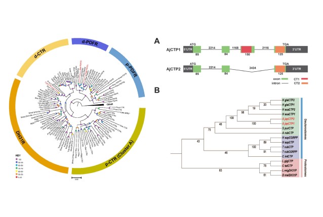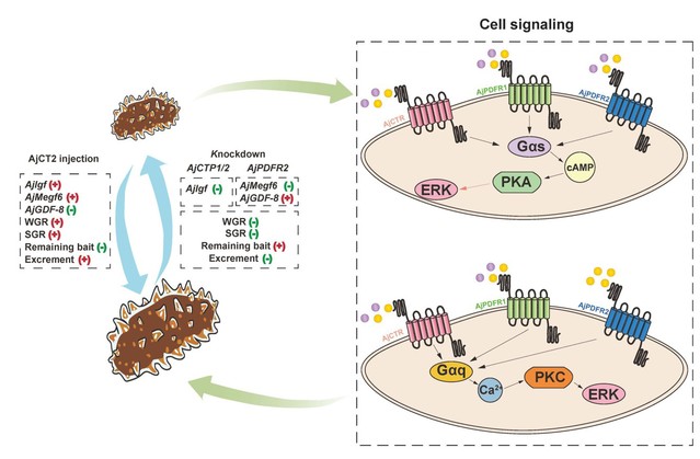 本研究以后口无脊椎动物中具有特殊进化地位的棘皮动物刺参(Apostichopus japonicus)为研究对象,解析了后口无脊椎动物中CT型神经肽信号系统及其生理功能。系统发育分析表明,CT型肽及其受体(CTR/CLR、PDFRs)的进化起源可追溯至两侧对称动物的共同祖先。进一步研究发现,刺参体内两种CT型神经肽AjCT1和AjCT2能够同时作用于CTR/CLR型受体(AjCTR)和两种PDF型受体(AjPDFR1与AjPDFR2),并差异性激活Gαs/cAMP/PKA/ERK1/2和Gαq/Ca²⁺/PKC/ERK1/2两条信号通路。体外药理学实验证实,AjCT1和AjCT2均能作为肌肉松弛剂,其中AjCT2的效果更强,AjCT2引起肠道剂量依赖性的松弛是由AjPDFR2受体所介导的。活体过表达与敲降模型研究发现,AjCT2/AjPDFR2信号通路具有促进刺参摄食与生长的关键生理功能。