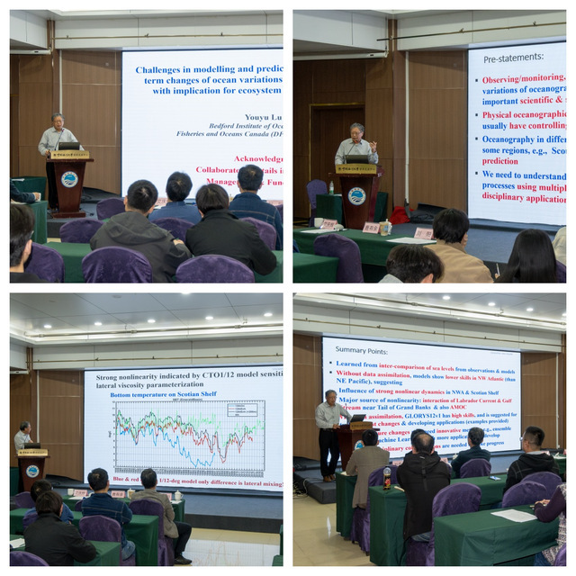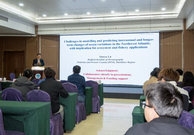 专家讲座阶段,鹿有余研究员做了题为“Challenges in modelling and predicting interannual and longer-term changes of ocean variations in the Northwest Atlantic, with implication for ecosystem and fishery applications(西北大西洋海洋变异年际及长期变化的模拟与预测挑战及其对生态系统和渔业应用的启示)”的学术报告。研究聚焦西北大西洋(尤其斯科舍陆架)海洋环境的年际及更长时间尺度变化,明确了其模拟与预测过程中面临的关键挑战,同时从物理海洋学角度阐释了海洋环境对于渔业生物生存和渔业资源可持续发展的影响。