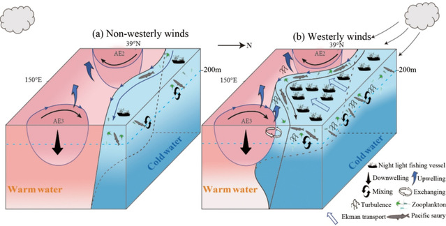 在与物理海洋学教育部重点实验室陈朝晖教授‌的合作研究中,团队利用潜标长期连续观测网络,并结合遥感与渔业数据,成功解析了2016年西北太平洋秋刀鱼渔场异常南移事件的机理。研究指出,亲潮冷水与中尺度暖涡相互作用形成了渔场空间基本格局,而天气尺度的西风事件则通过埃克曼输送诱导亚中尺度上升流,提升水体垂向混合和饵料集聚,驱动秋刀鱼日间分布动态的短期变化。2022级博士研究生张玉磊与崂山实验室博士后朱瑞琛为文章共同第一作者这是我校水产与海洋双一流学科协同攻关的标志性成果之一,凸显潜标立体观测技术及其与生态机制结合的科学力量,为远洋渔场环境立体检测示范应用提供全新实证与模式参考。