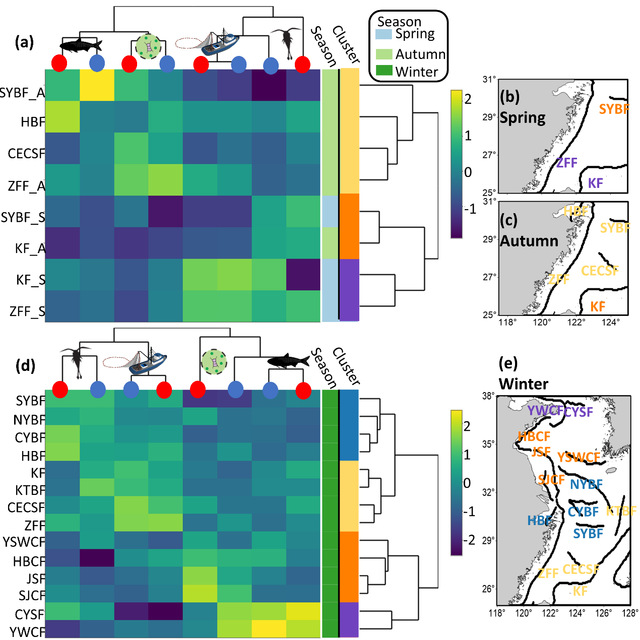 研究运用‌多频走航声学探测、水下视频、高分辨率卫星遥感及AIS渔业活动数据‌等新技术方法,成功构建‌三维观测分析框架‌,系统刻画东海陆架区中尺度锋面对浮游植物、浮游动物、鱼类及捕捞活动等多营养级影响的时空异质性。研究发现锋面生态效应存在显著的‌营养级空间解耦‌现象,不同季节、冷暖水侧、表层-底层及昼夜时段均呈现出生物动态聚集的复杂模式,突破了传统二维锋面研究的局限。这项工作凸显了‌多学科和新技术集成‌在阐明关键海洋过程生态效应及其与可持续渔业管理应用方面的前沿价值。2024级博士研究生聂凌云为文章的第一作者,这也是该生在中国陆架海生态声学领域第4篇SCI论文。