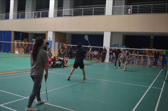 羽毛球比赛在青岛国信体育馆进行,设置男、女单打和混双3个项目,潘老师、李老师也友情参赛,比赛从中午12:00开始,经过激战于下午16:00圆满结束。同学们有的是第一次到正规羽毛球赛场打球,刚开始有些不适应,本着友谊第一,比赛第二的精神,同学们相互指导,整个赛场龙腾虎跃,充满着欢声笑语。最后徐武杰、王林同学获得男子单打冠、亚军,邓旭旭、刘胜男同学获得女子单打冠、亚军,王林&吕宁、徐武杰&薛菲菲同学获得混双冠、亚军,并赢得了研究室提供的奖品。