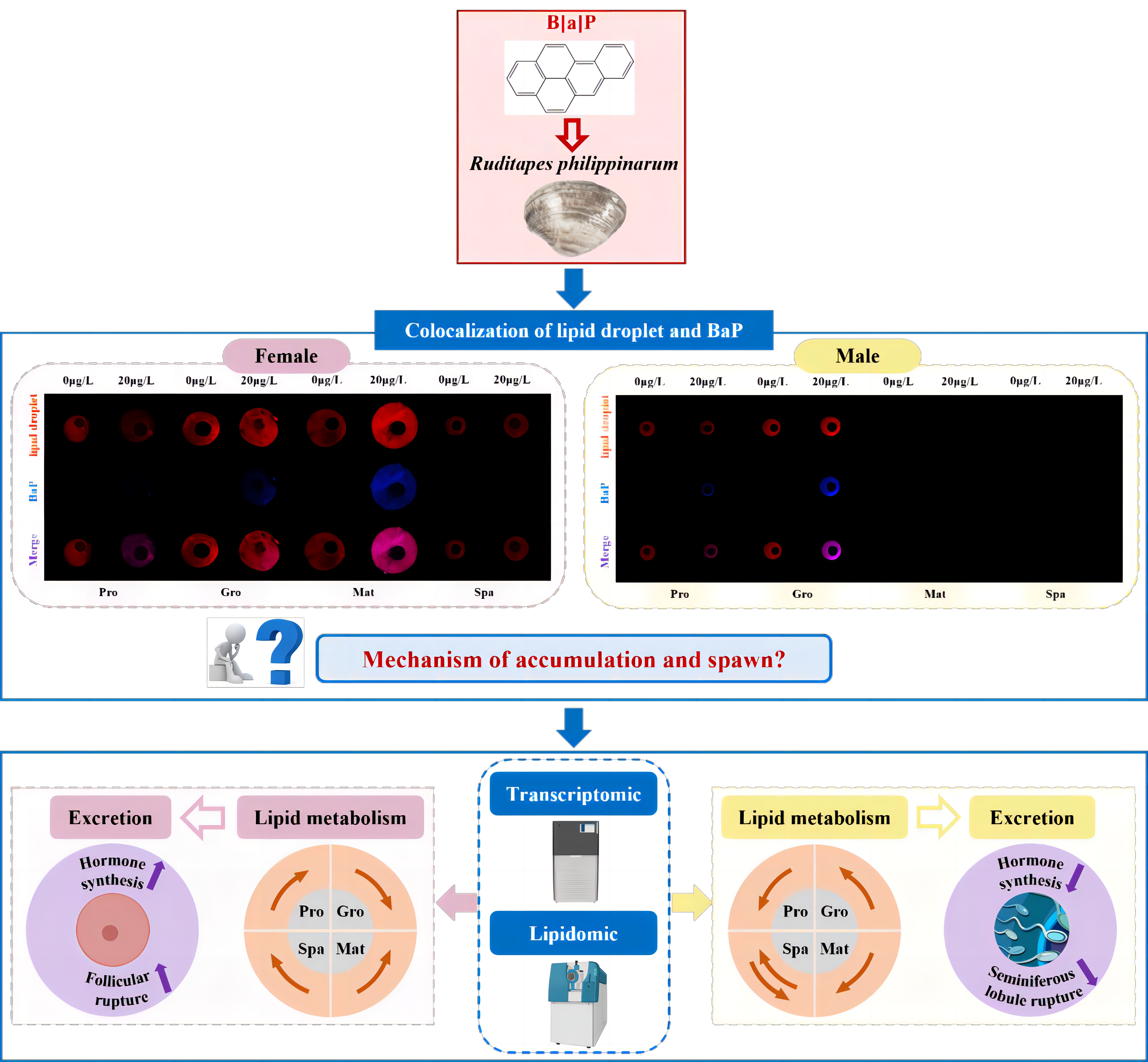本文选择PAHs为典型POPs,以致癌性最强的苯并[a]芘(B[a]P)为代表性PAHs,探究了B[a]P在菲律宾蛤仔体内蓄积与排出的分子机制。研究结果如下:证实PAHs在菲律宾蛤仔性腺中蓄积与脂滴具有明显的共定位现象;通过脂质组学查明了成熟期菲律宾蛤仔在B[a]P胁迫下性腺中甘油三酯增加的核心种类,卵巢主要是总碳原子数为48-58、酰基侧链有6-12个双键的甘油三酯(TGs),而精巢为总碳原子数为48-58、酰基侧键有4-14个双键的TGs;B[a]P干扰了卵巢、精巢发育期的脂质代谢,且雌雄的变化趋势相反;解析了B[a]P调控精子/卵子排出的作用途径,阐明B[a]P在水生动物生殖过程中的排出机制。研究成果不仅为贝类毒理学适应机制研究奠定了理论基础,也为海洋生态环境保护和水产品安全提供技术支持。