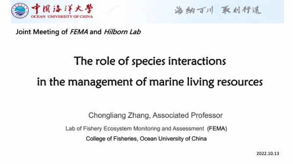 2022年10月13日上午8时(西雅图时间10月12日下午5时),中国海洋大学任一平教授科研团队与华盛顿大学Ray Hilborn教授科研团队成功举办zoom线上联合会议。本次联合会议旨在探讨渔业发展现状,搭建学术交流平台,促进深度合作。对话双方主要参与成员包括两实验室的教授、博士后和博士研究生等,共计20余人。