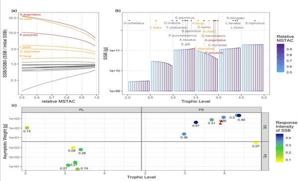 4.2 聚焦种间交互作用,真实反映渔业在群落层面的生态效应。对比目标种和非目标种对多物种TAC和单物种TAC策略的响应,拓展了对TAC管理策略间接影响的理解。量化分析不同物种特征响应强度差异,探究多物种TAC在鱼类群落中的响应机制。