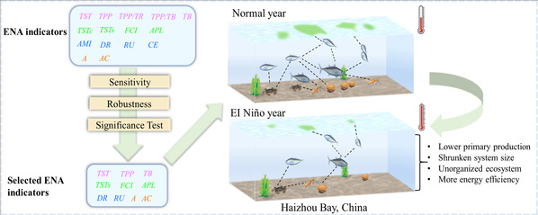 4.3 基于Ecopath生态模型和生态网络分析,选择了合适的生态网络指标来解析海州湾渔业生态系统对厄尔尼诺事件的响应,加强了厄尔尼诺对物种组成和能量流动影响的认识,促进了生态网络指标在基于生态系统渔业管理中的应用。