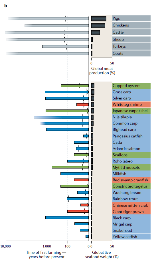 一、背景介绍 水产养殖对全球食物安全和经济稳定起着举足轻重的作用,且影响日益增大。全球90%以上的水产养殖分布在低收入和中等收入国家,保证了人类食物需求和经济增长,为联合国可持续发展目标做出巨大贡献。据联合国粮农组织(FAO)报道,2017年全球鱼贝类的年产量达到了1.726亿吨,其中水产养殖就占据了半壁江山。出于商业目的进行的海洋和淡水渔业捕捞给野生群体带来严重压力,使得渔业捕捞变得不可持续。与之相比,水产养殖业却日渐蓬勃。在野生捕捞和陆地农田开发有限情况下,水产养殖产品是非常实惠且营养的动物蛋白来源。然而,水产养殖集约化带来的环境问题,例如对生境的破坏和传染病爆发,对养殖群体甚至野生种群的健康和福利造成了负面影响,这一影响还可能因气候变化而进一步恶化。 通过对生产性状进行遗传改良,选择育种能够提高生产效益、减少水产养殖带来的环境污染问题。与家畜和农作物相比,水产养殖品种丰富,目前养殖的鱼类、软体动物、甲壳类,水生无脊椎动物、两栖爬行类,共计543个品种。全球有70个水产养殖品种占据水产养殖产量的80%;而畜禽养殖中,猪、鸡和牛三个品种的产量就占到了全球肉类产品的80%;作物中,水稻、小米、玉米和土豆占到了全球农作物产量的三分之二。在这丰富多样的水产养殖品种中,有两个共同的关键特征,大大增强了它们的遗传改良潜力:第一,水产品经历人类驯化时间短,其种群内遗传多样性丰富;第二,水产品具有高繁殖力和体外受精特点。因此,育种方案设计也就更灵活,挑选的优良个体能推广到到养殖户中,不需要多个世代的繁殖就能提供足够数量的优良个体用于生产。联合国粮农组织在最近的报告中也强调,对尚未开发且具有遗传潜力的水生物种进行驯化和选择育种,是水产养殖发展中一个不可错失的机遇。从水产养殖育种体系中获得的高遗传增益来看,生产性状的累积和永久改进的具有很大潜力,如大西洋鲑鱼每个世代的生长速度能提高13%,远高于畜禽生长性状的育种改良。 基因组学工具对遗传改良可持续性发展具有巨大价值。现阶段,由于具备了可负担和使用基因组工具的可能,从指导基础群体的选育,到促进封闭商业育种体系的基因组选择,我们可以将其应用于驯化和遗传改良的全过程。此外,基因组学还可用于野生物种遗传资源的特征描述、利用和保护,为管理养殖群体和野生群体之间的交流提供参考。 本文对水产养殖品种中的驯化和遗传育种进行概述,主要说明基因组工具的定向应用如何加速不同环境和物种中的遗传改良,探索了新兴基因组和生物技术的前景,以期逐步改进水产养殖的育种和生产。 二、水产养殖物种的驯化 本文将驯化定义为:从完全依赖野生种群变为完全在人类圈养下完成整个生命周期,并利用现代育种技术对生产性状(如生长和抗病性状)进行遗传改良的过程。从历史上看,在决定养殖哪些畜禽和水产品时,关键是选择特定环境下可繁殖的品种。例如,被驯化的物种往往表现出行为可塑性,这使得它们能够适应圈养环境。家畜和水产养殖物种存在一个关键区别,早在对饲养种群进行充分管理的数千年前,家畜的驯化与全球人类迁移已经在同步发生的,现代家畜已经经历过多样性下降的遗传瓶颈。相比之下,在水产养殖物种中,驯化和选择育种之间的时间间隔要短得多,大多数情况下两者是同时发生的。因此,基因组工具可以从一开始就用于优化和加速这两个进程,帮助我们深入理解这对物种基因组和生理的影响。