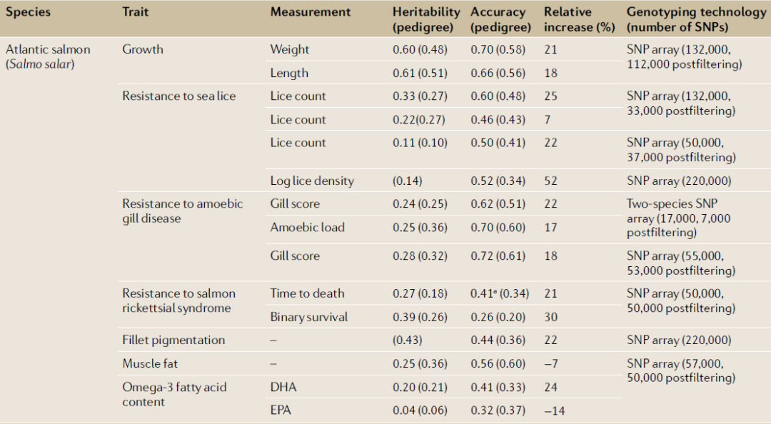 图2 水产育种体系中的基因组选择 水产养殖种的高繁殖力和庞大的家系使基因组选择具有两大优势:第一,即使是在使用低密度标记的情况下,水产养殖品种中参考群体与验证群体之间较高的亲缘关系仍能使估计育种值准确性(accuracy)较高;第二,常规性状测定可在不同环境下,对亲缘关系较近的个体实施,让数据更有价值。过去5年间,基因分型技术不断发展降低了分型成本,许多高价值的水产养殖品种都利用基因组选择技术进行了遗传改良。 大量全同胞家系的利用,使得家系内基因组选择、低密度标记估计家系基因组育种值和基于系谱信息估计育种值得以进行。在许多水产养殖品种中,相对于家系预测的准确性,基因组预测显著提高,前者对与生长和抗病性相关性状的预测准确性中值分别提高了24%和22%(表2)。