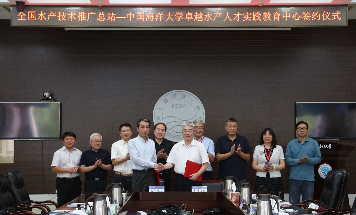 双方签约仪式现场 全国水产技术推广总站,是直属农业农村部的国家级水产技术推广机构,设在北京。1990年6月经人事部批准成立,为公益一类正局级事业单位。水产总站加挂“农业部渔业行业职业技能鉴定指导站”“全国水产引育种中心”“全国水产病害防治中心”“中国水产杂志社”牌子,是大力推广和普及渔业先进技术、新成果、新工艺、新品种、新产品和新设备,加快“科技兴渔”步伐,服务渔业、服务渔民,促进我国渔业生产和渔业经济稳步、健康、绿色协调发展的主力单位。 于志刚在致辞中对崔利锋一行莅临学校表示热烈欢迎,对水产总站积极响应和大力支持中国新农科水产联盟的成立表示感谢,对水产总站成立30周年表示祝贺。他指出,水产学科是学校的优势特色学科,水产总站拥有完备的技术体系,双方拥有良好的合作基础,中国新农科水产联盟和卓越水产人才实践教育中心也为双方提供了深入合作的平台。希望双方在人才培养、新业态塑造等方面全面务实合作,学校将全力支持卓越水产人才实践教育中心建设,努力为水产人才培养和产业发展做出海大应有的贡献。 崔利锋在致辞中对中国新农科水产联盟成立大会的顺利召开表示祝贺,对中国海洋大学长期以来对水产总站和中国水产学会的大力支持表示感谢,并简要介绍了水产总站和中国水产学会的主要工作。他表示,中国海洋大学是海洋科学和水产学科高等教育的最高学府,在水产人才培养中发挥着重大作用,双方联系密切,拥有广阔的合作空间,应以此次签约为新的起点,努力在人员培训、科技交流等合作方面不断取得新的成果,为新农科建设作出新的贡献。 根据协议,双方将合作共建国家大学生校外实践教育基地“全国水产技术推广总站—中国海洋大学卓越水产人才实践教育中心”,探索建立高校与水产技术推广示范基地联合培养人才的新机制,努力培养实践能力强、技术水平高、科研素质优、创新意识足的水产行业高质量工程技术人才,共同促进水产事业发展。