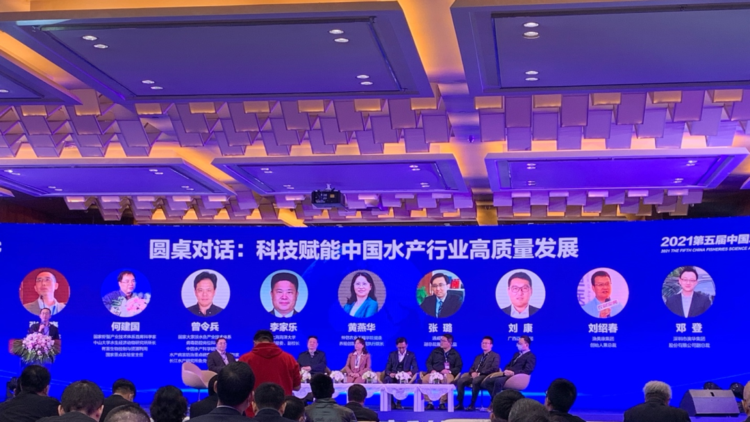 健康养殖创新研究院执行院长黄燕华,通威股份副总裁兼技术总监张璐,广西百洋集团总裁刘康,渔美康集团创始人兼总裁刘绍春以及深圳市澳华集团股份有限公司副总裁邓登一同参与圆桌对话,探讨科技赋能中国水产行业高质量发展。