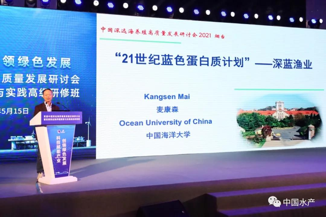 院士、上海交通大学特聘教授、船舶与海洋工程专家付世晓,山东省农业农村厅党组成员、副厅长王敬东,烟台市副市长牟树青,中国水产流通与加工协会会长崔和等在大会上讲话或做主题报告,来自全国10余省市的240余人出席活动。 麦康森院士就发展深远海水产养殖的重要性作专题报告,指出发展深蓝渔业是“21世纪蓝色蛋白质计划”的基石,未来水产养殖的空间在海洋、在循环水设施化养殖。因为深蓝渔业是人类食物安全供给不可或缺的组成部分;水产品是改善国民膳食结构,保障人民身体健康的重要物质;水产养殖饲料较之畜禽养殖更节约粮食,更保护环境;保护日益枯竭的野生渔业资源,必须限制捕捞,发展深远海养殖。此外,深远海水产养殖既可维护海洋国土安全,创造和平崛起的环境,又能摆脱淡水水域和陆地空间的限制,符合美丽中国建设的要求。10年前麦康森院士提出我国深远海养殖的战略目标是:以东海、南海深远海养殖为重点,开展关键技术与重大装备研发,构建“养一捕一加”相结合、“海一岛一陆”相连接的全产业链深远海养殖体系,国家战略性投入,引入多方资本,建立企业平台,形成全产业链新模式。用10年~20年时间,建成一批深远海大型养殖平台,形成海上工业化养殖生产群,为解决人类优质海洋蛋白质来源贡献中国方案。