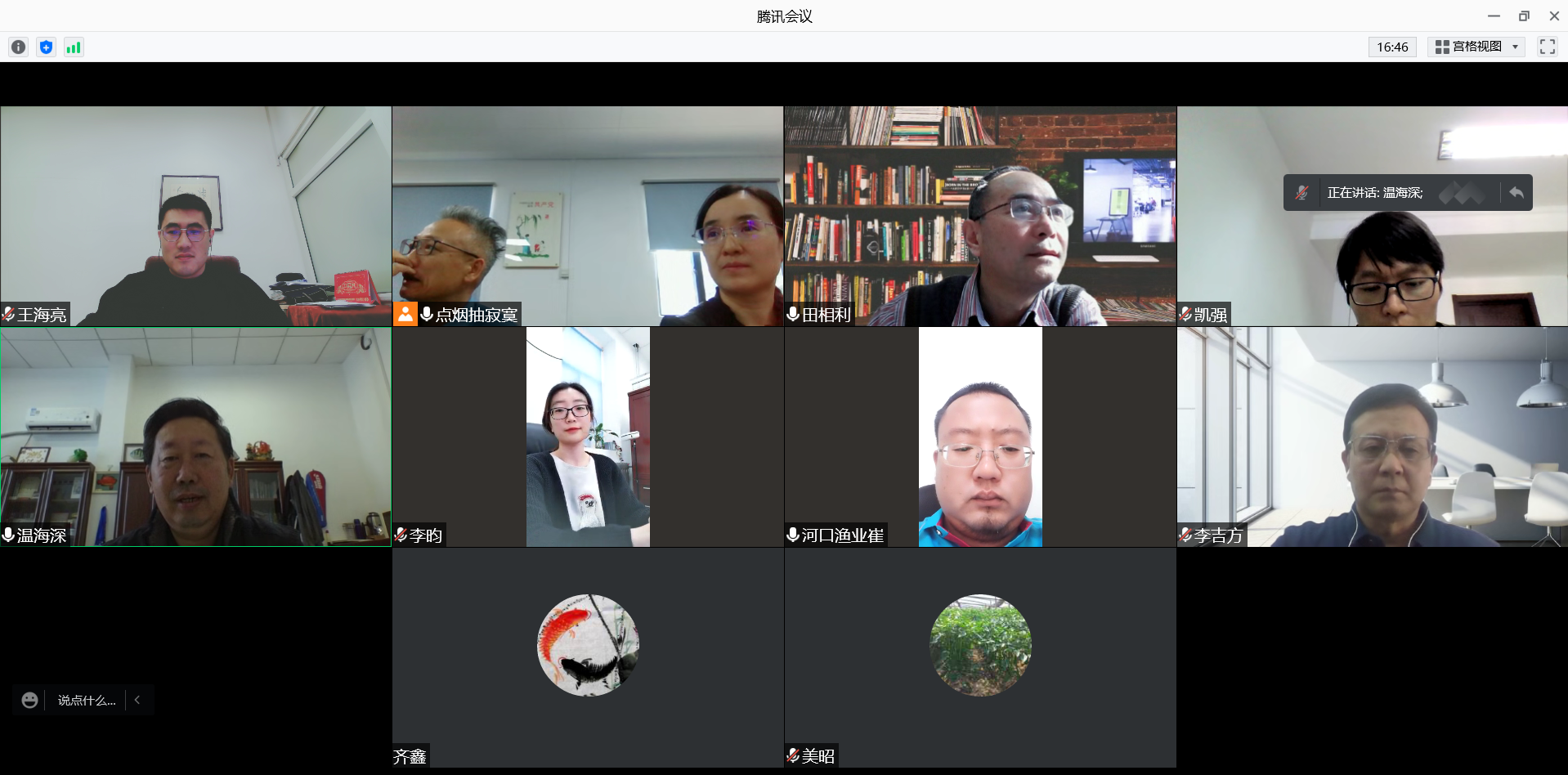 20211112日,温海深教授带领实验室花鲈组教师同珠海市斗门区管委会进行花鲈工作推进会议,斗门区管委会李炳秋处长,石晓艳副主任、崔阔鹏所长、李猛职员参加会议,会议通过线上腾讯会议展开。