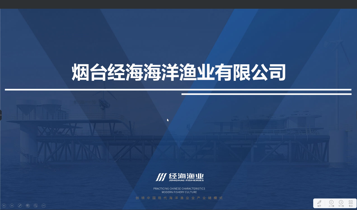 会议由温海深教授主持,他首先介绍了三方团队的参会成员,并概述了中国海大团队与两方的合作历程和共同目标。接着,推广总站李刚处长从推广总站基本情况介绍、2021年花鲈养殖试验情况、2022年“陆海接力”项目实施方案三个方面对推广总站在花鲈养殖模式方面取得成果和计划进行了阐述。经海渔业郭福元总经理简单介绍了公司概况、现有的产品、战略布局三个方面,并提出了北方养殖花鲈夏季病害、长距离运输、陆基进深海、市场价格等方面存在的问题。