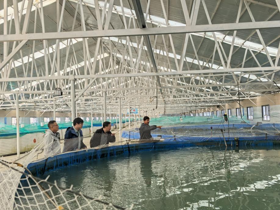 参观生产车间 团队前往新疆天蕴有机农业有限公司调研,公司总经理李春雨全程陪同。一行人首先参观了公司的三文鱼深加工生产车间,了解了三文鱼加工工序和工艺。随后,一行人观看了公司的宣传纪录片,并通过实施监控观看了公司各个基地的生产情况。期间,李总介绍了各个基地的虹鳟养殖产量,双方还就三倍体诱导技术、全雌生产技术、虹鳟养殖技术等进行了深入探讨。