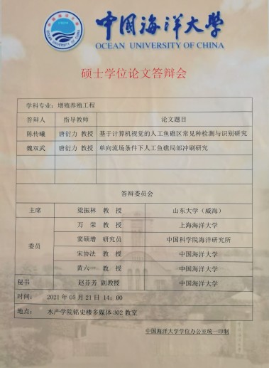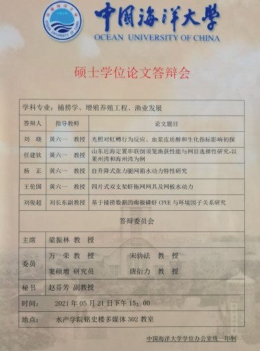 2021年5月21日下午,海洋渔业技术实验室在档案馆多媒体教室举行了2021届研究生毕业论文答辩。答辩委员会由山东大学威海分校海洋澳门彩票 常务副院长梁振林教授、上海海洋大学校长万荣教授、中国科学研究院海洋研究所窦硕增研究员、澳门彩票开奖结果查询网站 副院长宋协法教授、澳门彩票开奖结果查询网站 唐衍力教授、澳门彩票开奖结果查询网站 渔业系主任黄六一教授组成,其中,梁振林教授担任答辩委员会主席。赵芬芳副教授担任答辩委员会秘书。