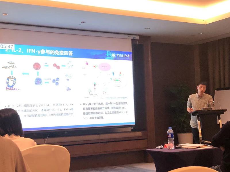 会议期间,战文斌一行与参会专家、各高校代表、各企业代表在鱼用疫苗研发与应用、有效防控水产养殖病害、推动科技成果转化等方面进行深入交流。启明星学术论坛环节中,王泓翔以《牙鲆IL-2与IFN-γ的免疫佐剂效应研究》为题作精彩报告并获大会研究生优秀论文一等奖。报告从鱼用疫苗佐剂研究背景入手,由浅入深揭示IL-2与IFN-γ参与免疫应答机理,阐明IL-2表达特性,并对IFNγ和IL-2进行生物学功能验证和佐剂效果评估。与会同学就上述内容在生产中的实际应用进行热烈探讨。