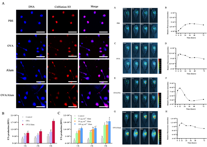 水产动物病害与免疫学研究室以牙鲆为研究对象,对抗原、铝佐剂和油佐剂免疫后的早期阶段腹腔内胞外陷阱(ETs)的释放情况进行了观察。此外,通过小动物成像仪,实现活鱼体内ETs的定性和定量分析。成果于2021年03月30日发表在领域著名刊物Frontiers in cellular and Infction Microbiology上(DOI: 10.3389/fcimb.2022.875409,IF=5.293)。