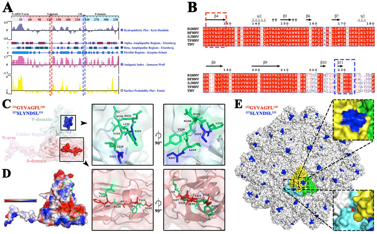 神经坏死病毒(NNV)是一种世界范围内流行,严重危害多种海水和淡水鱼类的传染性病原。衣壳蛋白(CP)是该病毒唯一具有致病性和抗原性的结构蛋白,然而有关其免疫优势表位或中和功能位点的公开信息仍然极其缺乏。基于前期基础,本研究利用特异性抗石斑鱼NNV(RGNNV)CP的中和单克隆抗体,结合部分重叠的重组截短蛋白以及合成肽库,在CP中鉴定出两个分别位于S-domain和P-domain的最小B细胞表位122GYVAGFL128和227SLYNDSL233。氨基酸定点突变分析表明,Y123、G126、L128和L228、Y229、N230、D231、L233分别是介导表位与相应抗体直接互作的关键氨基酸残基。一系列生物信息学及系统进化分析显示,227SLYNDSL233在所有NNV基因型中几乎完全保守,暴露在病毒粒子表面突起的顶端周围,具有良好的免疫原性;而122GYVAGFL128在RGNNV以外基因型中具有大量抗原漂移,埋藏在病毒粒子壳区与突起连接处的凹槽中,免疫原性较差。体外封闭实验表明,SLYNDSL合成肽可减少GF-1细胞表面RGNNV的附着,进而抑制病毒的复制增殖,而GYVAGFL合成肽则无此封闭效果。综上所述,227SLYNDSL233是一个受体结合位点,相应抗体与之结合可阻断病毒粒子与易感细胞的粘附,进而产生中和效果;而122GYVAGFL128可能是一个稳定病毒粒子构象的脆弱区域,相应抗体与之结合后可破坏病毒的天然结构,进而产生中和效果。研究结果丰富了人们对NNV抗原分布模式和中和分子基础的理解,为推动研发针对NNV的高效抗病毒药物提供了新的靶点。