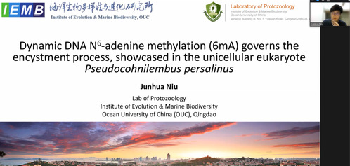 本次会议由美国阿尔比恩澳门彩票 Marcella Cervantes副教授主办,纽约州立大学Lydia Bright副教授和圣塔克拉拉大学的Brian Bayless副教授协办。会议共设置6个邀请报告,受邀者分别来自中国、日本、捷克、法国、阿根廷和加拿大。高珊教授课题组博士研究生牛俊骅做了题为Dynamic DNA N6-adenine methylation (6mA) governs the encystment process, showcased in the unicellular eukaryote Pseudocohnilembus persalinus的报告,介绍了6mA参与调控海洋纤毛虫-水滴伪康纤虫包囊形成的分子机制,得到了参会专家的认可与好评。报告主要内容已于近期发表在Nature index期刊Genome Research上。