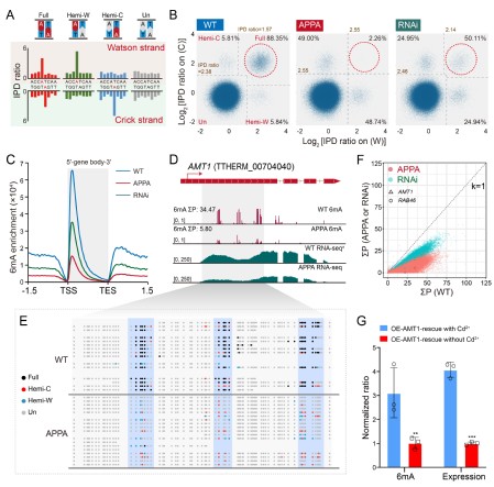图2.AMT1突变和敲降后的6mA水平分析。(A)6mA甲基化模式。(B)AMT1突变和敲降后的6mA甲基化模式。(C)AMT1突变和敲降后的整体6mA分布情况。(D)AMT1基因的6mA分布和mRNA表达情况。(E)AMT1突变后AMT1基因的6mA 单分子模式。(F)AMT1突变和敲降后所有基因的6mA水平变化。(G)拯救细胞中AMT1基因的6mA和mRNA表达水平。