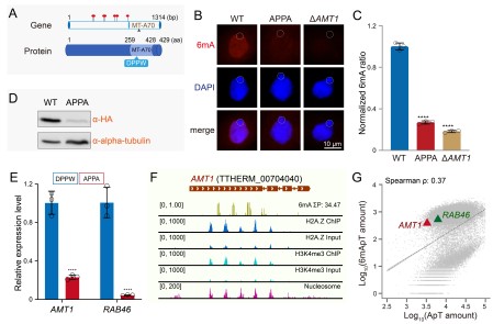 团队前期以四膜虫为研究材料,鉴定出AMT1是四膜虫的主要6mA甲基化酶[7]。AMT1基因缺失会造成细胞生长缓慢,且伸缩泡异常增大。然而,AMT1如何参与基因表达调控,从而影响细胞生长发育的分子机制仍未知。