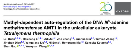 2025年1月,原生动物学研究室高珊课题组在Nucleic Acids Research杂志发表题为“Methyl-dependent auto-regulation of the DNA N6-adenine methyltransferase AMT1 in the unicellular eukaryote Tetrahymena thermophila”的研究成果。这项研究以四膜虫为模式材料,发现了6mA甲基化酶AMT1的自调控和转录调控机制,并且探究了其在接合生殖时期的动态分布及生理功能,为6mA作为表观遗传标记在真核生物中参与转录调控和其他生理功能调控提供了重要线索,为未来进一步探索真核生物中6mA的功能调控机制奠定了理论基础。