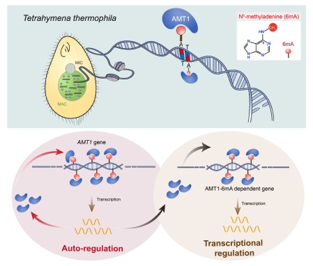 DNA N6-甲基腺嘌呤(N6-methyladenine, 6mA)已被报道参与真核生物的转录调控等关键生物学过程[1-6]。然而,6mA与转录的关系在不同真核生物中表现出明显差异,其参与转录调控的具体机制尚未充分阐明。嗜热四膜虫(Tetrahymena thermophila)作为一种重要的单细胞真核模式生物,已被报道含有较高的6mA水平,由甲基化酶AMT1(Adenine Methyltran sferase 1)催化,且6mA与转录存在正相关关系,是研究6mA与转录调控机制的理想体系。