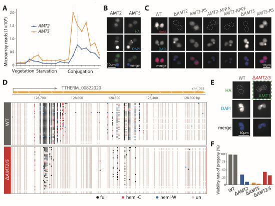 图2. AMT2和AMT5调控新大核中6mA的从头建立。(A)AMT2和AMT5在新大核发育时期高表达;(B)AMT2和AMT5定位在新大核;(C)AMT2/AMT5敲除导致新大核6mA水平下降,野生型AMT2/AMT5回补可使新大核中6mA水平恢复,突变回补不能使6mA水平恢复;(D)SMRT-CCS结果显示敲除株系中6mA位点数大量减少,甲基化水平显著下降;(E)敲除株系后代中AMT1蛋白水平相比野生型上调;(F)AMT2/AMT5敲除导致后代存活率下降。