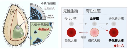 单细胞真核生物四膜虫具有独特的双元核型(同一个细胞里有一个大核和一个小核)和有性生殖过程(接合生殖)。无性生殖期间,6mA只分布于大核,在小核中完全缺失。而有性生殖时期,作为基因储存库的母代小核生成配子核、并进一步受精形成合子核。其中,部分合子核发育为子代新大核。在此过程中,没有6mA的合子核发育成有6mA的新大核,会发生全基因组范围的从头甲基化,为寻找6mA从头甲基化酶提供了理想的窗口期(图1)。