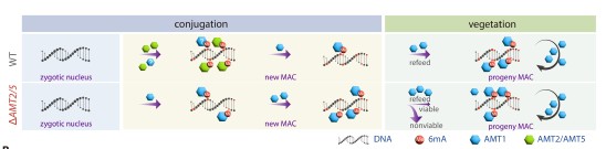 图1.四膜虫是研究6mA从头甲基化的理想模式:在合子核发育为子代新大核的过程中,6mA完全从头建立。