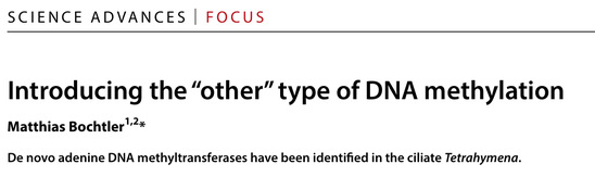 Science Advances同期发表由波兰分子和细胞生物学研究所Matthias Bochtler教授为该研究撰写的题为Introducing the “other” type of DNA methylation的聚焦评论。Bochtler教授肯定了该研究选择纤毛虫研究DNA甲基化的优势,提出了从头甲基化和维持甲基化过程对腺嘌呤和胞嘧啶上甲基化修饰的必要性。从DNA甲基化酶的组成讨论了四膜虫与高等真核生物的甲基化系统之间的显著相似性,并进一步讨论了纤毛虫为何会选择建立一种基于腺嘌呤甲基化的表观遗传系统,以及6mA从头甲基化酶在高等真核生物中是否存在的可能性。