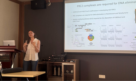 Solberg博士则主要介绍了组蛋白修饰对DNA删除的作用机制。Solberg博士与原生动物学团队毕业生王春荻博士合作,鉴定了草履虫中的多梳抑制复合物2(PRC2),并揭示了其在DNA删除过程中的作用机制。其最新研究工作鉴定出了34种染色体结构域蛋白,并进一步筛选出两组在 PRC2 介导的DNA删除中至关重要的组蛋白甲基化识别蛋白:Firefly1/2 和 Mayfly1-4,基于该研究进一步完善了组蛋白修饰在DNA删除过程中的分子机制和工作模型。